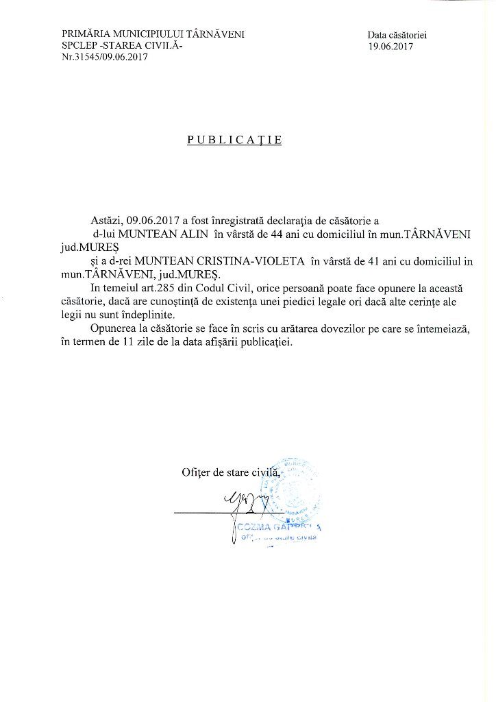 Publicatie casatorie – Muntean Alin si Muntean Cristina Violeta June 9, 2017 admsite Publicatii casatorie