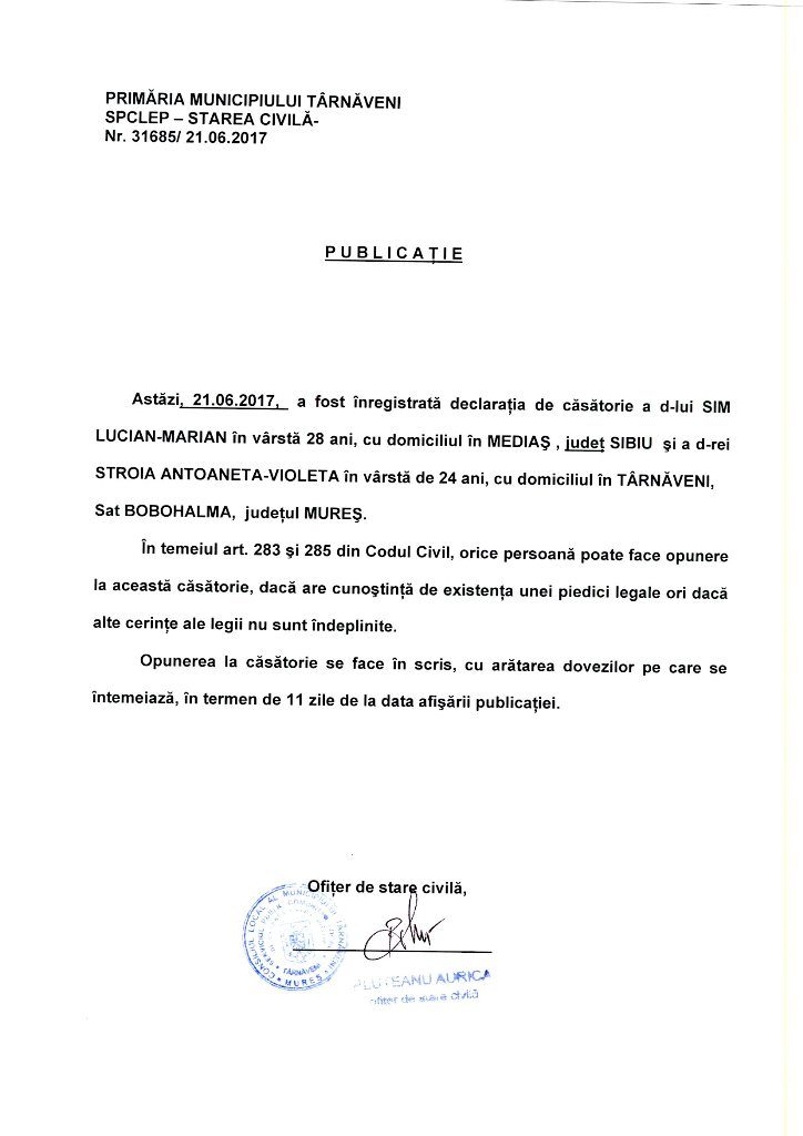 Publicatie caasatorie – Sim Lucian Marian si Stroia Antoaneta Violeta June 21, 2017 admsite Publicatii casatorie