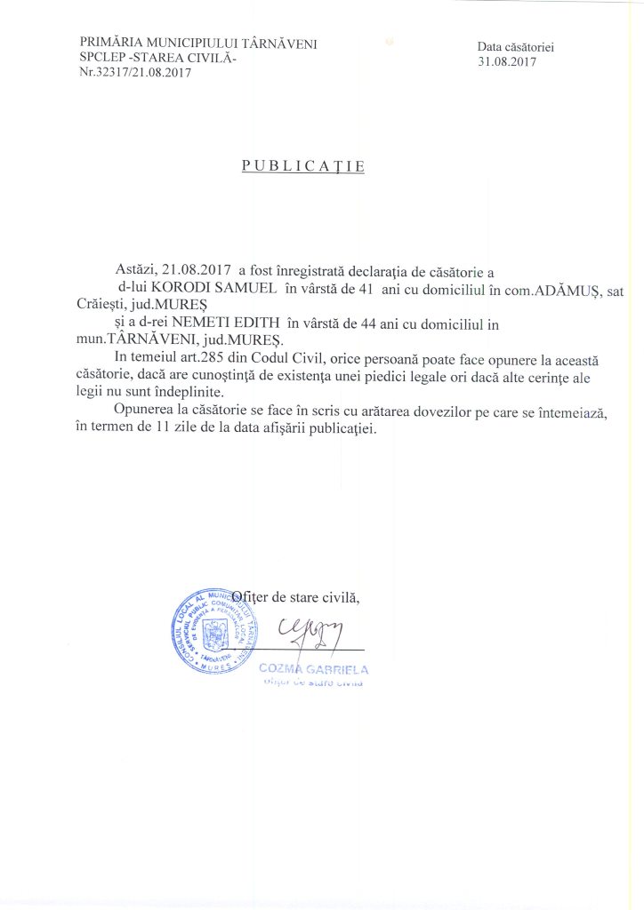 Publicatie casatorie – Korodi Samuel si Nemeti Edith