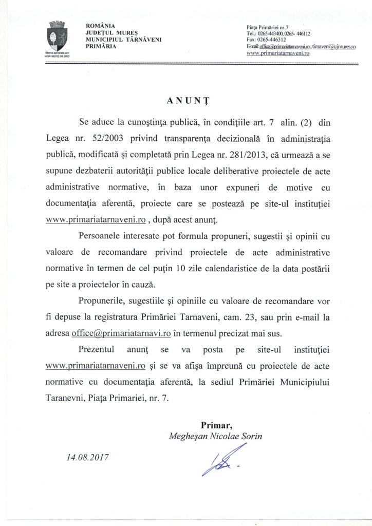 Piaţa Primăriei nr. 7, oraşul Târnăveni, judeţul Mureş, Tel: +40-265-443400, E-mail: office@primariatarnaveni.ro