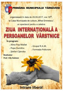 organizează în data de 29.09.2017, ora 1600,  la Casa Municipala de cultura „Mihai Eminescu”, un spectacol pentru a celebra ZIUA INTERNAȚIONALĂ A PERSOANELOR VÂRSTNICE. În program: