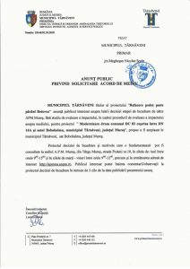 Proiectul deciziei de încadrare şi motivele care o fundamentează pot fi consultate la sediul A.P.M. Mureş, din Târgu Mureş, strada Podeni nr.10, în zilele de: luni între orele 900-1500 și în zilele de marţi – vineri între orele 900-1200, precum şi la următoarea adresă de internet http://apmms.anpm.ro. Publicul interesat poate înainta comentarii/observaţii la proiectul deciziei de încadrare în termen de 5 zile de la data publicării prezentului anunţ.