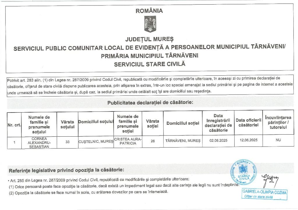 PUBLICAȚII CĂSĂTORII – 02.06.2025