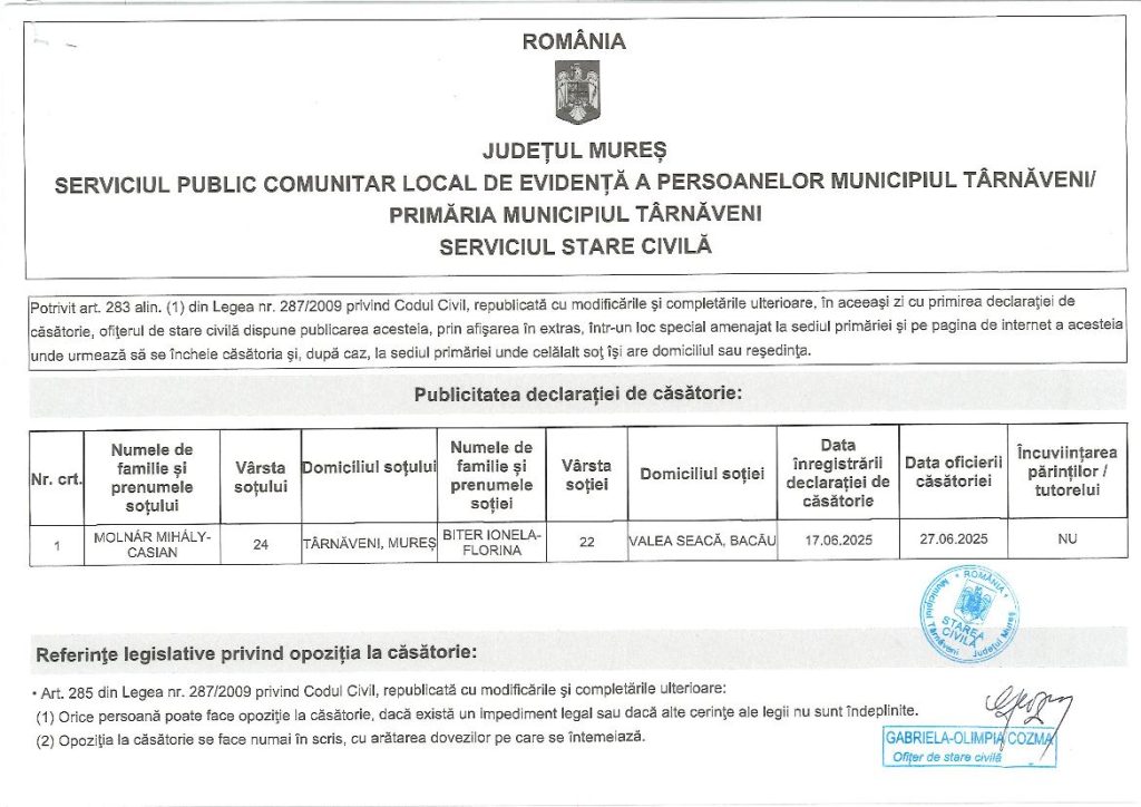PUBLICAȚII CĂSĂTORII – 17.06.2025