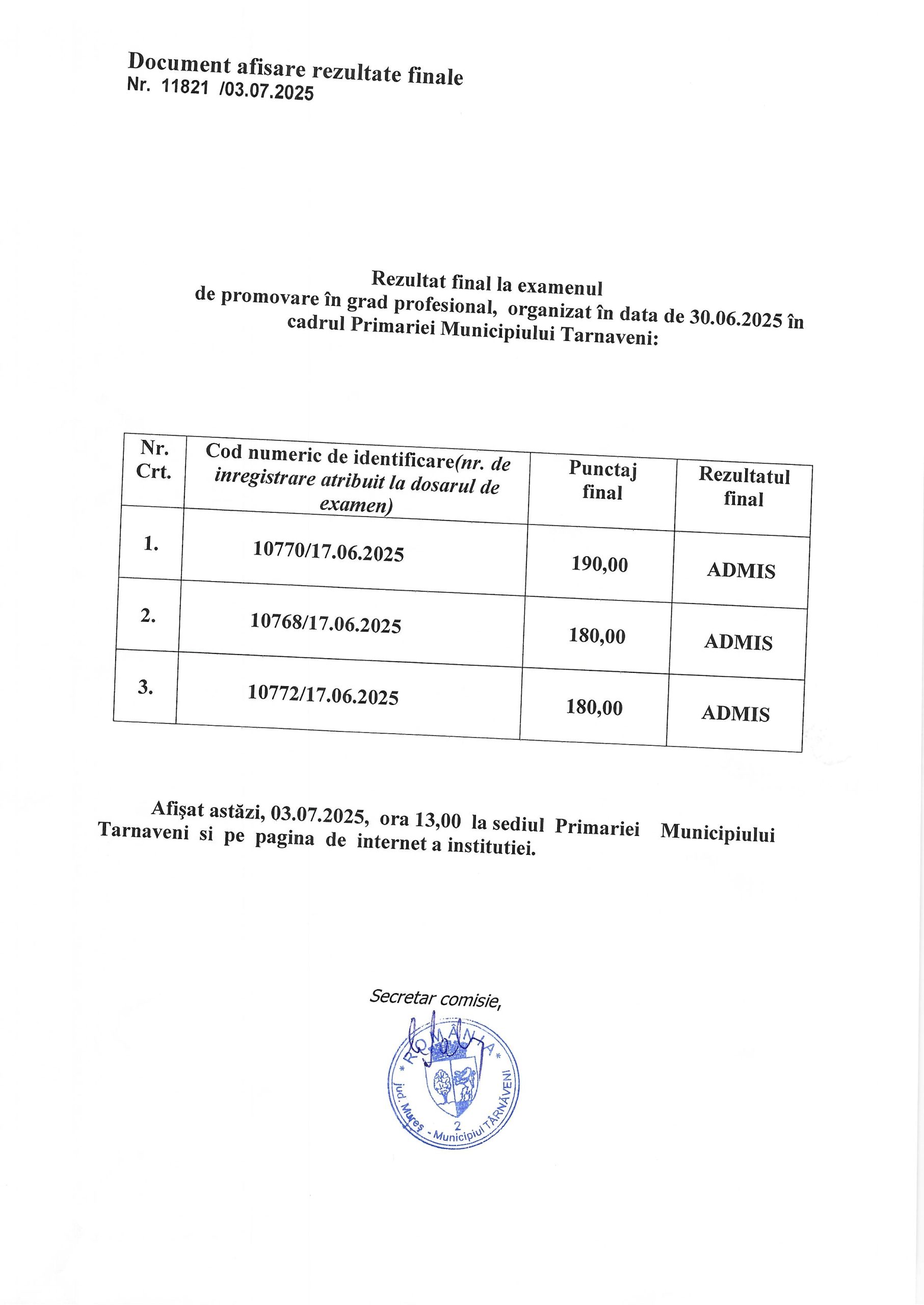 Rezultatul final la examenul de promovare in grad profesional organizat in data de 30.06.2025