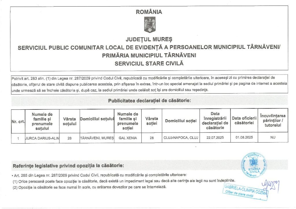 PUBLICAȚII CĂSĂTORII – 22.07.2025