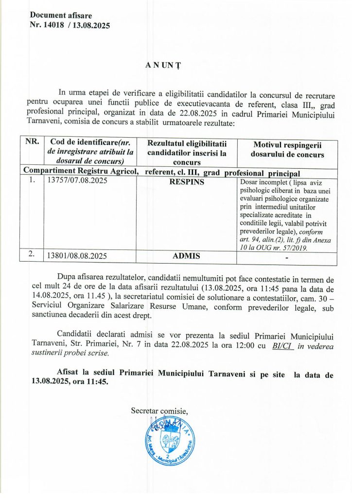 Anunt – rezultatul verificarii eligibilitatii candidatilor la concursul de recrutare organizat in data de 22.08.2025