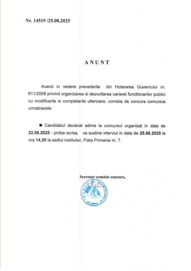 Anunt privind comunicarea candidatului declarat admis la concursul organizat in data de 22.08.2025