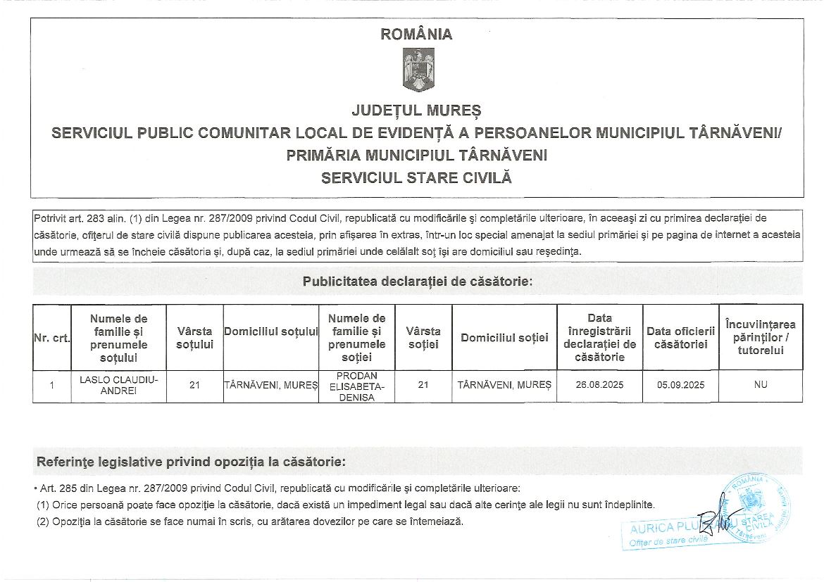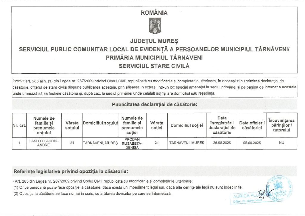 PUBLICAȚII CĂSĂTORII – 26.08.2025