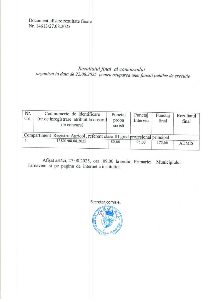 Rezultatul final al concursului organizat in data de 28 august 2025 pentru ocuparea unei functii publice de executie