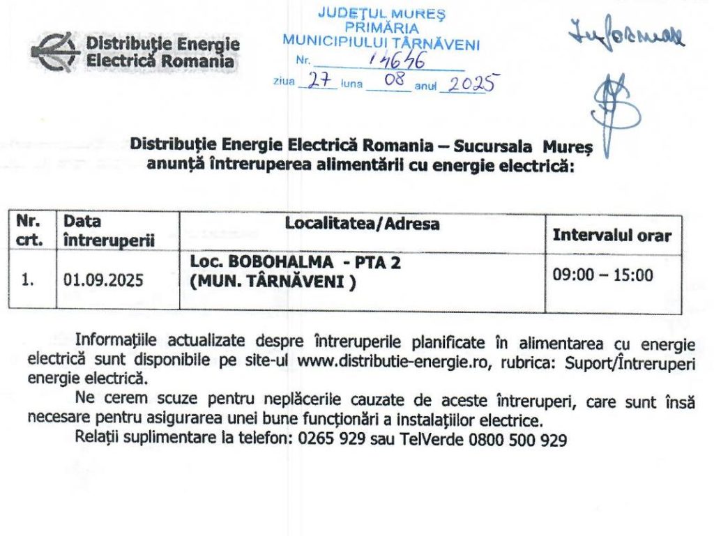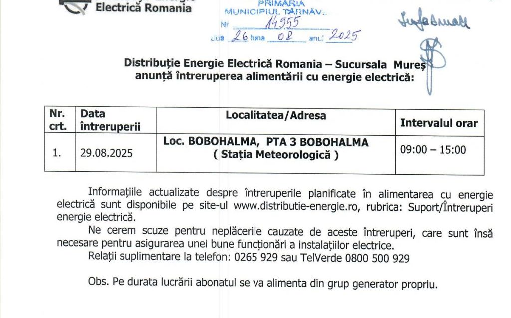 Intreruperi planificate in alimentarea cu energie electrica