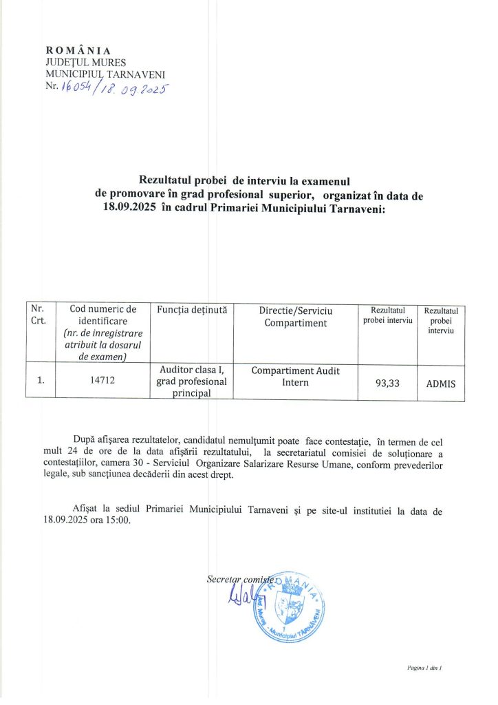 Rezultatul probei de interviu la examenul de promovare in grad profesional superior organizat in data de 18.09.2025 September 18, 2025 adm-mmm Concursuri