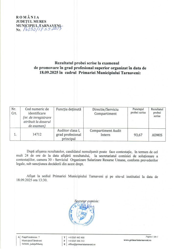 Rezultatul probei scrise la examenul de promovare in grad profesional in data de 18.09.2025 September 18, 2025 adm-mmm Concursuri
