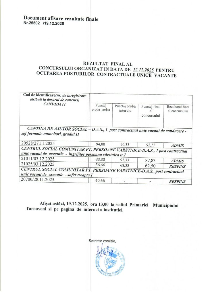Rezultatul final al concursului organizat in data de 12.12.2025
