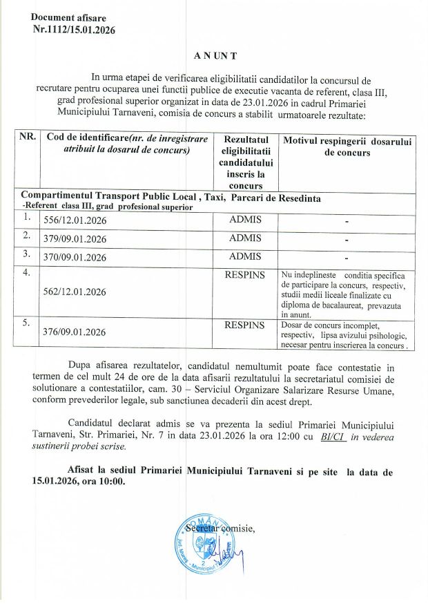 Rezultat – verificare eligibilitate candidati la concursul de recrutare pentru ocuparea unei functii publice de executie vacanta, organizat in data de 23.01.2026 January 15, 2026 adm-mmm Concursuri