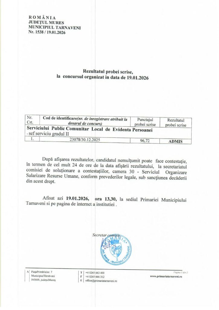 Rezultatul probei scrise la concursul organizat in 19.01.2026