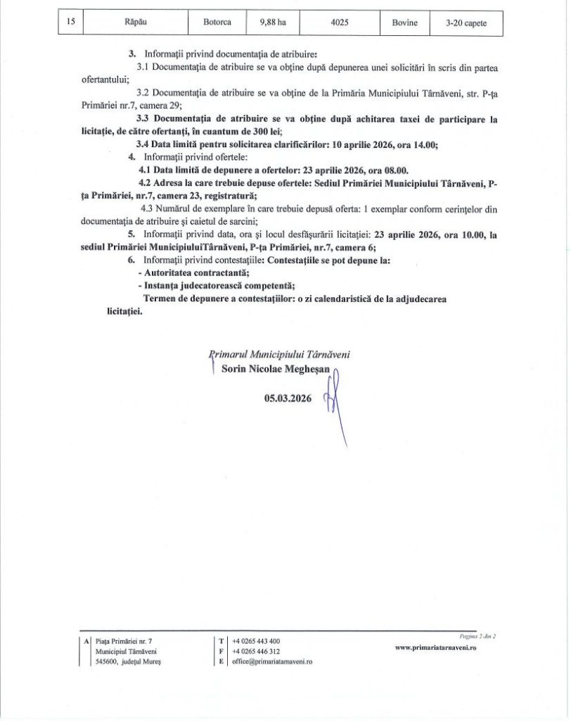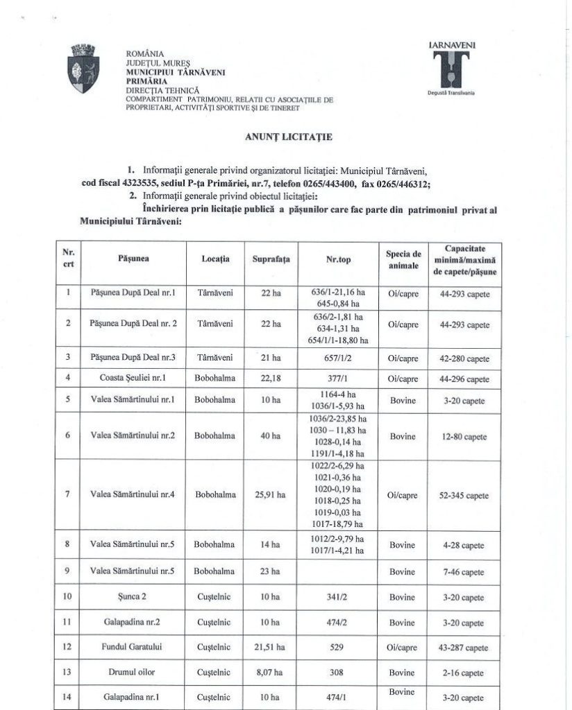 Anunt licitatie – închiriere prin licitatie publică a pășunilor care fac parte din patrimoniul privat al Municipiului Târnăveni March 6, 2026 adm-mmm Anunturi