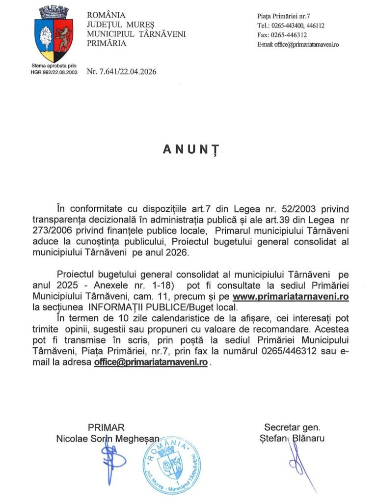 Anunt – Proiectul bugetului general consolidat al municipiului Târnăveni pe anul 2026 April 23, 2026 adm-mmm Anunturi